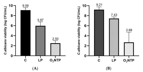 Efficacy of non-thermal O2 plasma on C. albicans viability. (A) Contaminated glass slides. (B) Contaminated resin samples. C: Control (untreated samples); LP: 120-min low-pressure exposure; P1: 120-min non-thermal O2 plasma (O2 NTP) exposure.