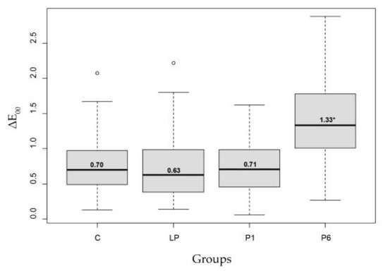 Box plots. ∆E00 of groups C, LP, P1 and P6. P6 showed a significant color change compared to the other groups (C, LP, P1); * significant difference according to Kruskall-Wallis and Wilcoxon rank sum tests (p < 0.05).