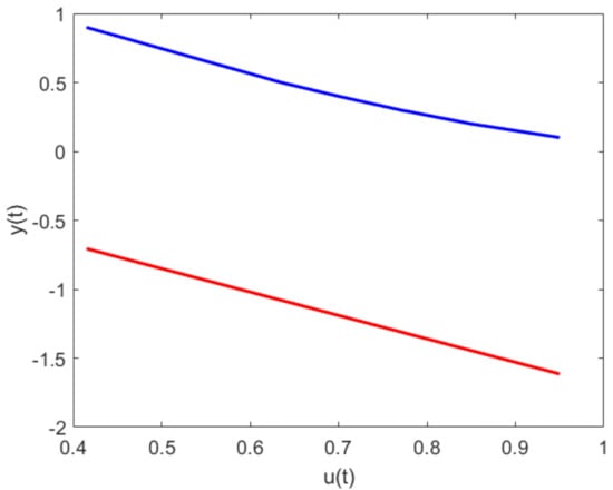 The first method is based on the knowledge of the transfer function of the linearized system (1) derived, considering parameters given by the manufacturer [21]. It starts with stabilizing the given unstable system. In the next step, the dynamics of compensation of the emerging disturbances are specified. By neglecting the fast stable mode of transients, the design procedure can be made simple and robust, similar to model-based PI control [22]. The controllers designed by the first approach make it possible to measure the input–output steady-state characteristic (IOSSCH) of the system, expressing the dependence of the output variable of the system on the input in steady states (Figure 2). While the analytically derived transfer function of the system results in a linear dependence of the output from the input at steady states, the measured dependence shows non-linear properties of the system. It indicates that, in an effort to accelerate transients by this approach, we would have to deal with the limited accuracy of the linear model. Although the proposed control meets most of the above requirements, it will be relatively slower in terms of transient speed.
