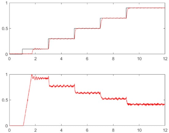 The corresponding step responses in Figure 7 and Figure 8 show much faster responses than with the first method. The steady-state control error can be eliminated by a more accurate inverse IOSSCH approximation for lower reference signal values, extended possibly by gain-scheduling, modifying the value, depending on the reference setpoint r. However, when the circuit properties change (e.g., by increased coil temperature), the used control structure is not able to change its properties, and a permanent error may reappear again.