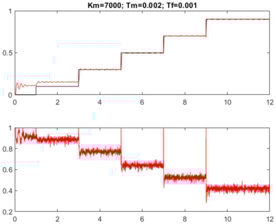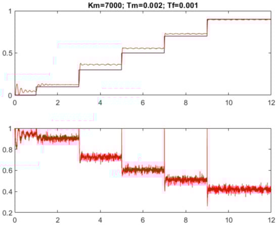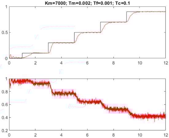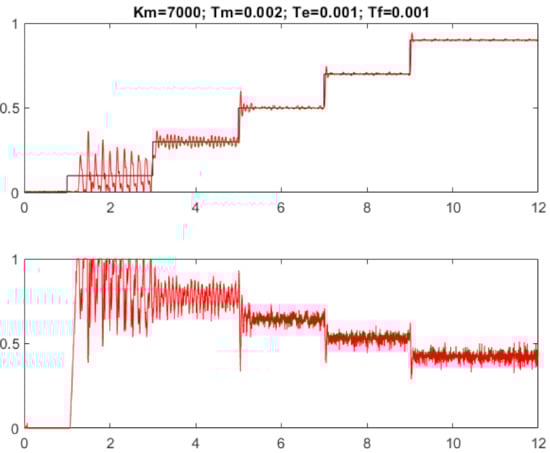 The filter dynamics can again be considered by an equivalent delay (20). The PID controller proportional gain is now significantly higher than of PD controller (27), which, together with increased derivative gain , lead to increased sensitivity to the measurement noise and plant model imperfections of the transients in Figure 11.