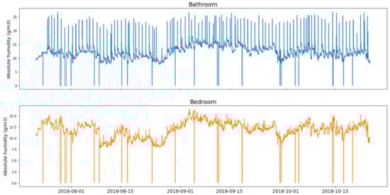 The Renson dataset used in this work was captured from a Healthbox 3.0 installed in a real house with two ventilated rooms: a bathroom and bedroom. The data contains time series for the following sensor metrics: temperature, , absolute and relative humidity and VOC (bathroom only). The data were sampled at 30 s intervals and was collected for 94 days. During the first 3 days, the house was not yet in use; during the next 14 days, the house was used normally; and during the remaining 77 days, the bathroom door was kept open so temperature/humidity/VOC was easily transferred between both rooms. Figure 1 displays the absolute humidity signals present in the dataset. Large spikes in the humidity signal of the bathroom (top of the figure) are attributed to showers. Smaller increases in the humidity signal of the bedroom (bottom of the figure) often occur after a shower and capture the spreading of humidity in the bedroom when the bathroom door is opened, a so-called shower echo effect. Humidity spikes do not occur at the start of the dataset, since the house was not in use during the first three days. Please note that variance in the indoor humidity signals is also influenced by outside weather conditions. Zero values in the signals indicate missing values due to data transmission failures.