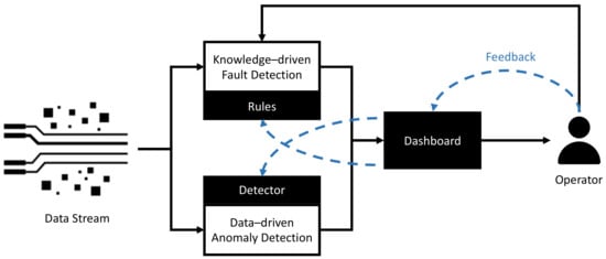 The general overview of how knowledge- and data-driven techniques can be combined is provided in Figure 2 and is a schematic representation from the work described in previous research [4]. The events originating from the data stream are being delivered to both the knowledge-driven fault detection component and the data-driven anomaly detection component. Based thus on either predefined rules (in the knowledge-driven component) or a machine learning technique (in the data-driven component), faults and/or anomalies are, respectively, visualized in a dashboard application to the operator. This operator is able to tune the rules within the fault detector manually. However, by providing feedback through the dashboard application, both the knowledge- and data-driven detection models can be updated automatically. In the knowledge-driven model, new rules are automatically derived from confirmed anomalies by analyzing the correlation between such occurring events. In the data-driven model, additional labelled feedback is used to detect similar future unseen events, evaluating to a more general supervised detection approach. In this case, the labelled feedback instantiates a supervised machine learning fault detector.