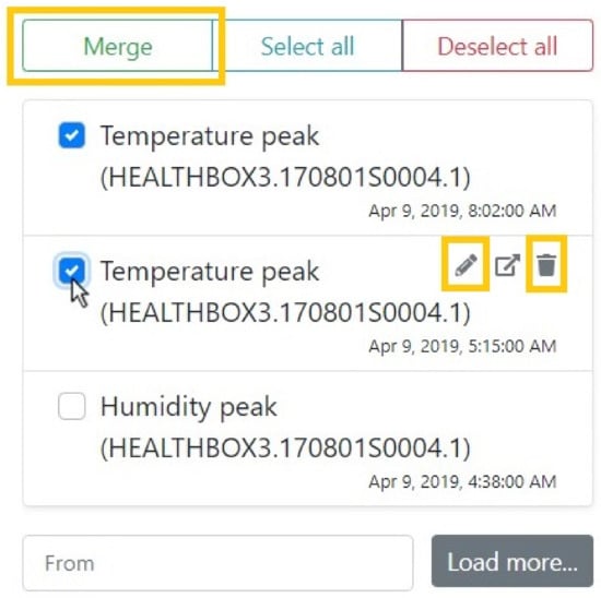 - Merging event alerts, by selecting multiple alerts and then clicking the merge button (see Figure 3). This indicates that multiple detections (e.g., over different signals) actually belong to a single event. When doing so, a new event is created in the dashboard’s back end system with the types folio:MergedAnomaly and folio:ConfirmedAnomaly. The selected events will be linked as children to the new, parent event with the property folio:hasSubAnomaly. If all child events have the same description or are of the same type (e.g., folio-ext:ShowerAnomaly), the merged event is also assigned that description and/or type, otherwise an additional manual labeling by the user is required.