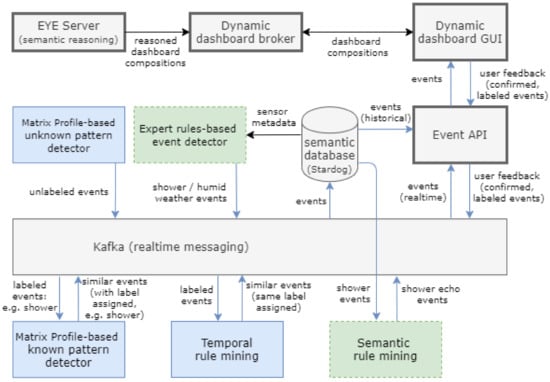 An Event API serves as a utility web service to the dashboarding GUI for retrieving, storing or updating events. The Event API streams events, as soon as they are detected, from Kafka, to the dashboarding GUI, using the WebSocket protocol (https://tools.ietf.org/html/rfc6455, accessed on 17 August 2021). Furthermore, the dashboarding GUI uses the Event API for fetching historical events (e.g., the events that occurred over the past month) from permanent event storage, using Stardog’s data querying endpoint and the SPARQL querying language (https://www.w3.org/TR/sparql11-overview/, accessed on 17 August 2021).