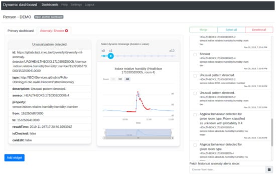 In order to visualize events, the system needs to know what type of information is captured by each sensor. This information is available in the sensor metadata, which is stored in a semantic database. To describe dashboard specific components (e.g., metrics, widgets, visualizations) and their relationships, an open-source ontology has been created and published in an online repository (https://github.com/idlab-predict/ddashboard-ontology, accesssed on 15 October 2021). Listing 2 shows the metadata for the sensor It describes what type of data the sensor holds that a dashboard can visualize. In this case, values are specifically supported. This allows dashboard operators to attach visualization configurations such as boundaries for sensor values (e.g., “acceptable values are between 400 and 1000 ppm and can be displayed with green dots”) or document that special visualizations are supported. In addition to this metadata, the property of a sensor (e.g., a sensor of a specific Healthbox, is linked to a dashboard metric that is supported and can be visualized (dashb:produces).