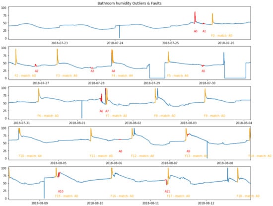 The descriptive labels assigned to events can be reused by the adaptive detectors described in Section 9. Figure 6 illustrates how the known pattern detector can automatically suggest many labels based on a small amount of patterns that were verified and labeled by the user. In this figure, we see the humidity of the bathroom over a period of 21 days. Red segments (annotated with “A”) are suggested events detected by the unknown pattern detector from Section 5. After a user verifies and labels A0 and A4 as shower events (with A4 representing two consecutive showers), the known pattern detector will automatically recognize the orange segments (annotated with “F”) as shower events because of the pattern-wise similarity. These matches will be reported as new events that are linked to the original event. In this short example, two interactions of the user in the first week of data led to a total of seventeen automatic labels. A demo movie (Available at https://www.youtube.com/watch?v=r7ygntYFLxo, accessed on 11 July 2021) shows the full system in action and demonstrates this automated event labeling over a larger timespan.