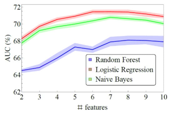 The logistic regression classifier seems to always achieve slightly higher performances than the others, although overcoming the Naïve Bayesian classifier of a few percentage points. The best performance was reached with seven features for the Naïve Bayesian and logistic regression classifiers, whereas eight features were needed for the RF classifier.