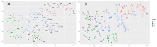 Clustering of positive (a) and negative (b) cases in three groups identified by PAM algorithm on overall hold-out training set. In the clustering plot of positive cases, we have indicated the FN, whereas in the clustering plot of negative cases we have indicated the FP.