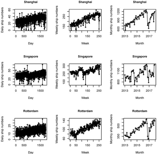 As this research investigates the long-range dependence and multifractality for ship flow sequences in container ports, we extracted required container ship flow data from the Automatic Identification System (AIS) database. The data span is from 1 January 2013 to 31 December 2017 for three representative container ports in the world—that is, Shanghai, Singapore, and Rotterdam. Figure 1 represents the original data of ship flow at different time scales for these three container ports.