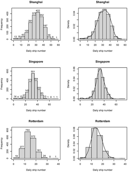 Frequency and probability density distribution of daily ship flow sequences.