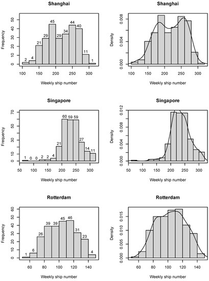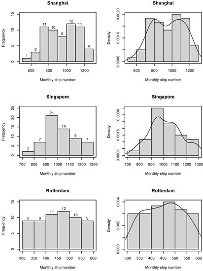 On the other hand, the kurtosis reflects the sharpness of the image. The higher the kurtosis, the sharper the center point on the image; in this sense, the kurtosis measures the degree of data aggregation in the center. In this study, the traditional kurtosis is replaced by the “super kurtosis” calculation method, which is to subtract the kurtosis 3 of the normal distribution from the original kurtosis so that the comparison benchmark is zero. Table 2 shows that the super kurtosis values of daily ship flow sequences are greater than 0, indicating that the daily ship flow sequence distributions are more concentrated and have a longer tail than the normal distribution. In the weekly ship flow sequences, only the super kurtosis of Singapore is greater than 0. The super kurtosis of all the monthly ship flow sequences are less than 0, indicating that these sequences are scattered and have a shorter tail than the normal distribution. Therefore, only the daily ship flow sequence of three ports and the weekly ship flow sequence of Singapore exhibited the characteristic of “sharp peak or fat tail”. Further, the ship flow sequences of three ports with different time scales deviated from the normal distribution. The results are further validated by the frequency and probability density distribution of ship flow at the port in Figure 2, Figure 3 and Figure 4.