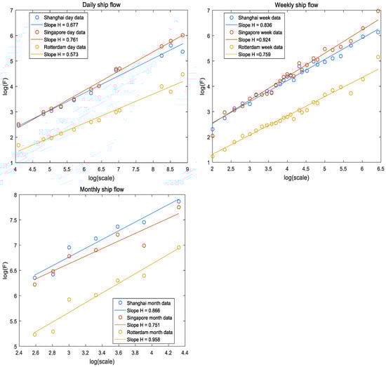 Figure 5 depicts the fluctuation function F versus scale for the ship flow sequences of three ports with different time scales in log-coordinates and the OLS linear regression for these curves when q is equal to two. We calculated the generalized Hurst exponents from the slopes of these straight lines. The Hurst exponent of all the ship flow sequences was greater than 0.5, which indicated a positive long-range dependence and persistence in these ship flow sequences.