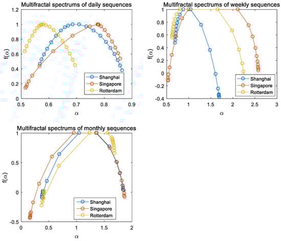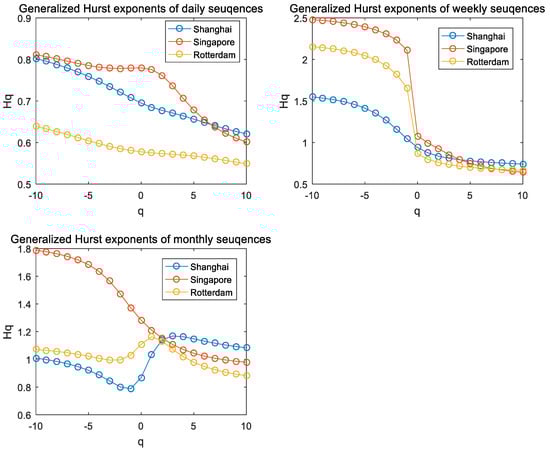 Figure 6 presents the results for the MF-DFA methodology for . Qualitative results showed that the generalized Hurst exponent for all ship flow sequences decreased with the increase in q; the generalized Hurst exponent of these ship flow sequences is dependent on the selection of q. However, for the monthly ship flow sequence in the ports of Shanghai and Rotterdam, this dependence on q was not significant. The differences in generalized Hurst exponents of daily and weekly series for three ports seem to be smaller as q increases. The generalized Hurst exponents for port of Singapore decreased faster than those for Shanghai and Rotterdam with the increase in q in all time scales. In particular, there was no substantial change in generalized Hurst exponent of the monthly ship flow series for Shanghai and Rotterdam; remained between 0.8 and 1.2 with the increase in q. For the monthly sequence, when q is less than zero, the generalized Hurst exponents of Singapore and Rotterdam are larger than that of Shanghai; meanwhile, when q is larger than zero, the situation may change to the opposite, and the generalized Hurst exponent of ship flow for Shanghai becomes the largest. These results suggest that these differences are not spurious or due to error measures. An important additional comment is that the degrees of multifractality of ship flow sequences in Shanghai and Singapore container ports are much higher than the ones found for ship flow in Rotterdam port.