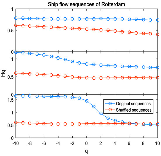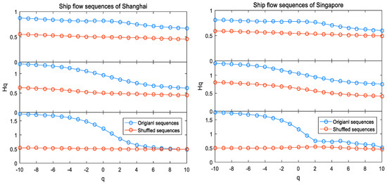Table 3 presents the results for long-range dependence in ship flow sequences of three ports when q is equal to two. Empirical results suggested high Hurst exponents for ship flow sequences. An important feature of these results implied that, in general, Hurst exponents becomes larger as the time scale increases. The port of Singapore has the highest Hurst exponent in weekly ship flow sequence, which is close to 1. However, in the monthly ship flow sequences, Singapore obtains the lowest Hurst exponent, which is just 0.751. Therefore, ship flow sequences in the port of Singapore have a higher Hurst exponent when the time scale is small. On the contrary, the ship flow sequences in the ports of Shanghai and Rotterdam have a higher Hurst exponent when the time scale is larger. Moreover, the differences in Hurst exponents under different time scales seem to be higher for the port of Singapore.