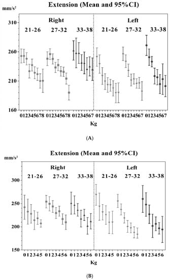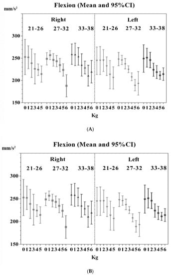 The weights used to perform the elbow flexion-extension movement in degrees of functionality varied according to the gender of the participants (Figure 2 and Figure 3). In the case of males, the weights (kg, x-axis) and velocity (mm/s2, y-axis) used were graded up to eight kilograms (for males belonging to the younger age group), whereas in the case of women, they were unable to perform the action with this weight, and the weight decreased (maximum six kilograms, with part of the female sample not being able to reach this weight). In both groups, the younger participants demonstrated greater stability (precision in the performance of the movement, which means not performing muscle compensations) in the execution of the gesture than the older volunteers. According to gender, the women displayed greater stability throughout the functional ROM compared to the men, who needed more weight to stabilize the entire movement requested.