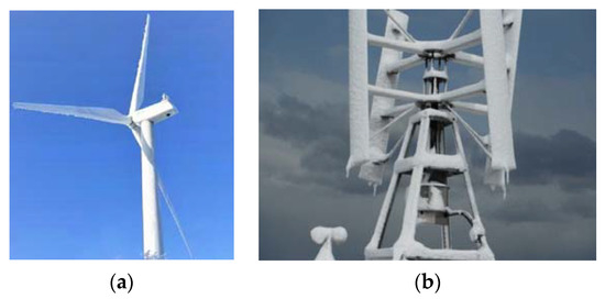 Extreme conditions, such as low temperatures, a humid environment, sandstorms and so on, have significant effects on rotating machinery, such as wind turbines and helicopters [1,2,3]. When wind turbines are working in cold and humid conditions, the blade surfaces are prone to icing. This changes the aerodynamic profile of the blade and reduces the output power of the wind turbine. As shown in Figure 1, icing accretions occur on the blade surfaces of horizontal axis wind turbines (HAWTs) and VAWTs, leading to increases in weight.