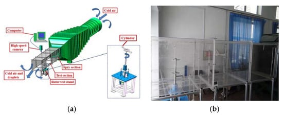 In the present study, the icing tests were carried out in an icing wind tunnel system, which was designed and built as a combination of a conventional wind tunnel and a cold natural environment. The computer model and a picture of the experimental system are shown in Figure 3.