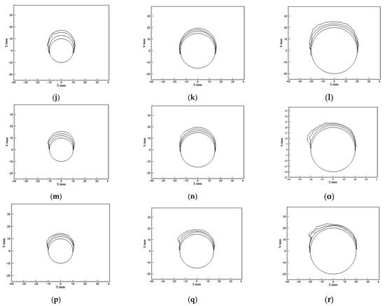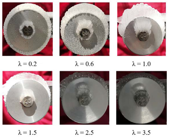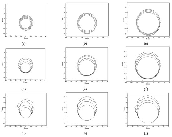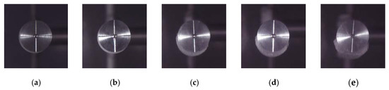 In the present study, the ice layer was assumed to be distributed evenly along the cylinder axis, due to the short cylinder height of only 20 mm. Therefore, at any cross section of the icing cylinder perpendicular to the axis, the profile of the icing shape can be selected as the icing shape on the cylinder surface. For convenience in recording the icing shape, the profile of the icing shape at the end face of the cylinder was used to explore and analyze the icing characteristics. Pictures of the icing on the rotating cylinder surfaces taken from the end face of the cylinder are shown in Figure 5.
