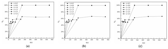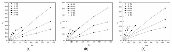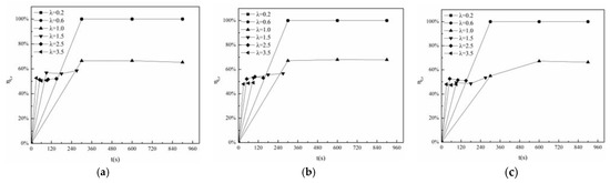 As shown in Figure 13 and Figure 14, the limits of icing on the left and the right sides of the cylinder reached 100% for low rotational speeds. This means that the surface of the cylinder was completely covered by the ice layer. As the rotational speed increased, both the icing limits gradually decreased and approached approximately 50%. This showed that the diameter of the cylinder and the icing time both had small effects on the icing limit. According to these data, it was found that the icing limits for each size of cylinder rapidly reached the maximum values in a short time from the beginning of the icing time. Then, they changed only a little with icing time.