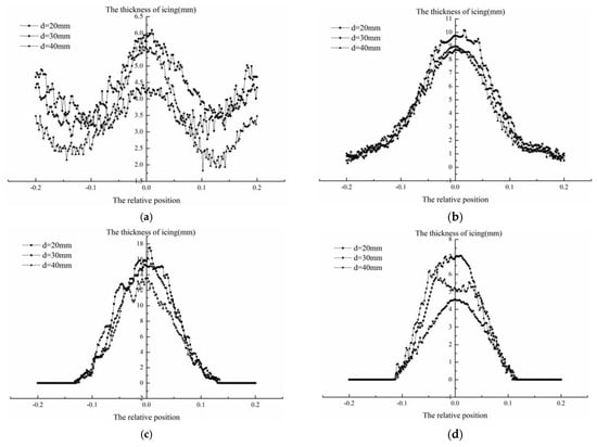 As shown in Figure 15, the origin of the coordinate system is located at the highest point in the figure, which is the forefront point of the cylinder against the wind. The positive direction of the coordinate system is clockwise and the negative direction is counterclockwise. The range of coordinate values characterizing the relative positions of the points on the cylinder surface is from −0.2 to 0.2. The thickness of the ice layer at each point along the cylinder surface was characterized using the coordinate system, as shown in Figure 16.
