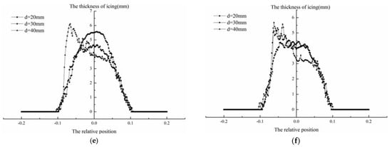 As shown in Figure 16, the main icing region was near the origin position on the cylinder surface. When the rotational speed or the TSR was low, e.g., 0.2, the ice layer symmetrically covered the whole cylinder surface. With an increase in the rotational speed or the TSR, the icing regions in the ranges of −0.2 to −0.1 and 0.1 to 0.2 gradually decreased until they disappeared. As a result, the range of the icing region was from −0.1 to 0.1, representing the left icing limit and the right icing limit. From these figures, it is concluded that the thickness of the ice layer on the cylinder with a diameter of 20 mm was largest at the origin point. This indicates that icing on a cylinder with a small radius or large curvature has a significant effect on the profile of the icing body. In addition, with an increase in the rotational speed or the TSR, the effect of the rotational speed on the stagnation point deflection angle increased, especially for the cylinder with a large diameter. As shown in these figures, when the diameter was 40 mm and the TSR was 2.5 or 3.5, the stagnation point was located at the left limit position of −0.1.