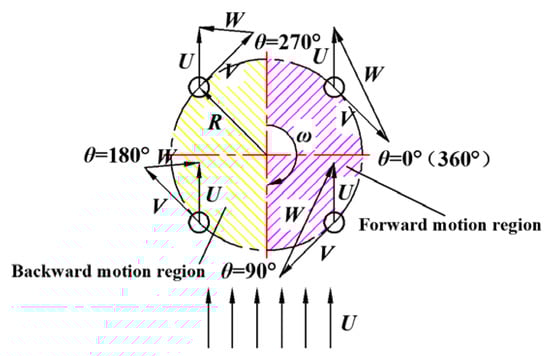 In the rotation mode of Figure 17, the relative wind speed, which is the vector difference between the wind speed and the linear speed of the cylinder, and its direction vary with the rotational speed of the cylinder, as shown in Figure 18 [25].