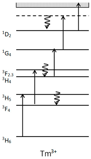 With respect to the sample fiber test experiment mentioned above, ultraviolet and blue light are rarely used as the pump in the actual fiber laser, in fact, they are generated by the upconversion of the pump. Blue luminescence was observed in Tm-doped fiber pumped at 1.06–1.14 μm [4,10,11,14,55,56], as the three-photon-induced 1G4-3H6 transition of Tm3+ (Figure 1). The same Tm ion continuously absorbs multiple photons to reach a higher excited-state energy level, thus emitting ultraviolet and blue light.