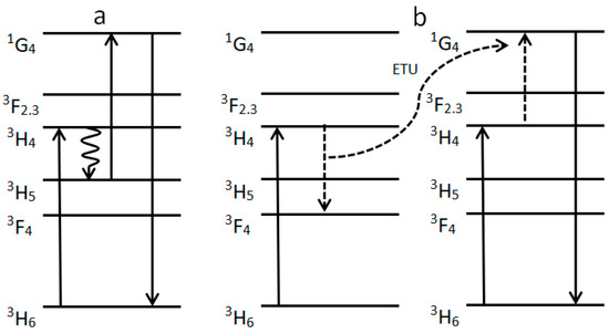 In 2010, G. Frith et al. [13] discussed the processes of generating blue light in 790 nm pumped Tm-doped fibers pumped and how fiber composition influenced these processes (Figure 2). Figure 2a shows the avalanche upconversion process. Tm ions absorb a photon with a wavelength of 790 nm, transiting from 3H6 to 3H4, and then reach 3H5 through a non-radiative transition. Next, the ions at the 3H5 absorb a photon with a wavelength of 790 nm again, so as to enter a higher energy excited-state (1G4). Figure 2b shows the energy transfer upconversion. Tm ions absorb a photon with a wavelength of 790 nm, transiting from 3H6 level to 3H4 level. During the transition to 3H5, the energy generated is transferred to another Tm ion excited to 3H6, thus entering a higher energy excited-state (1G4).