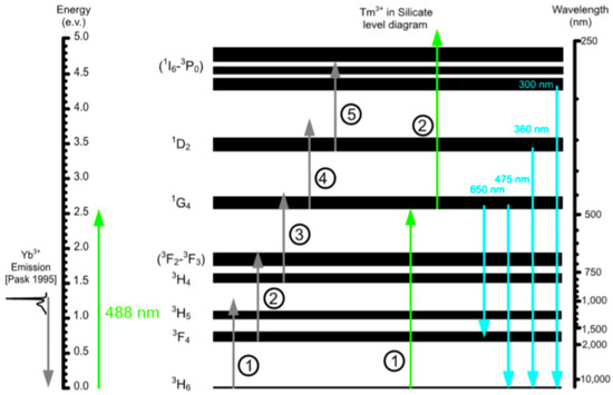 It is known that Tm3+ ions can easily up-convert infrared light to visible or ultraviolet light [58,59], especially, when they are coupled with Yb3+ ions [60]. It is known that Tm ions with 1G4 level show a strong absorption band at about 488 nm and Tm ions at 1G4 level can be excited to 1I6-3P0 level by ESA, so as to up-convert 488 nm radiation to its ultraviolet [61]. PD was observed in Tm-doped silica optical fibers pumped at 475 nm wavelength [8,9].