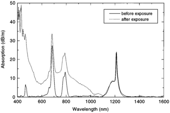 Absorption spectra of fiber C before and after exposure to 200 mW of power at 1.12 μm for 120 s. Adapted with permission from [4] © The Optical Society.