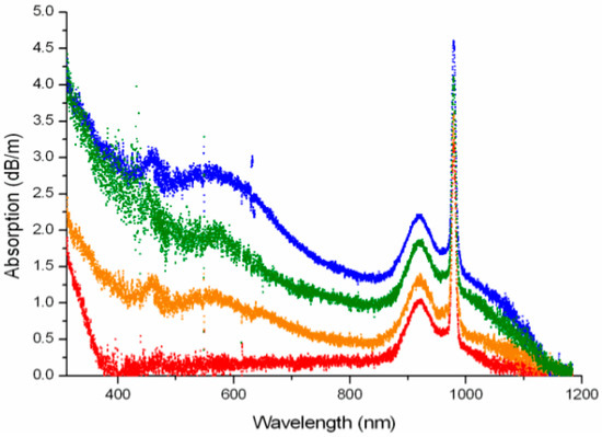 Absorption spectra of an unphotodarkened LMA Yb-doped fiber (red curves) and of the same fiber at different states of PD at 7 min, 15 min, and 100 min (orange, green, and blue) of pumping the fiber by the light of 45 W at 976 nm. Adapted with permission from [2] © The Optical Society.