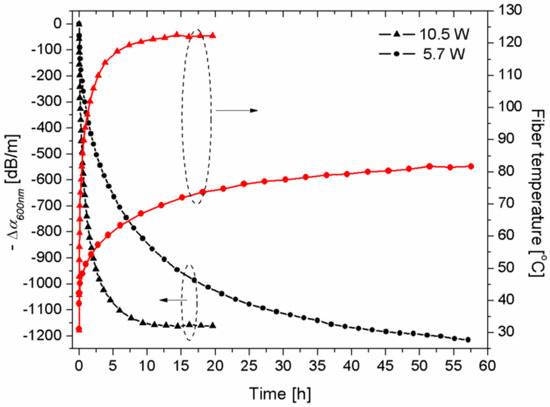 PD results in the decrease of laser power, and the lost energy is eventually converted into the heat inside the fiber, which causes the temperature of the fiber to rise. In 2010, Ponsoda et al. [38] measured the temperature of Yb-doped LMA fiber during a PD experiment using a thermal camera. In these experiments, the fiber temperature was measured while PD experiments were performed using infrared radiation (i.e., 915 nm). When the pump power was 5.7 W and 10.5 W, the attenuation of the core absorption coefficient and the change of the fiber temperature during the pumping process of the probe signal with the wavelength of 600 nm were detected simultaneously. They observed that the temperature increased as the loss increased (Figure 7).