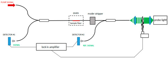 The device introduces a lock-in amplifier to extract probe light. To ensure the same degree of PD in the sample fiber and provide convenience for temperature control, the sample fiber needs to be short enough. Interestingly, PD has been shown a reversible process by applying thermal treatment [50,92] or ultraviolet irradiation [2] to the Yb-doped fiber. Therefore, it is possible to repeat the experiment without replacing the optical fiber sample. This device is most commonly used in PD experiment [14,22,25,28,30,33,37,73]. It cannot only measure the characteristic wavelength absorption, but also can be used in absorption spectrum measurement and refractive index measurement.