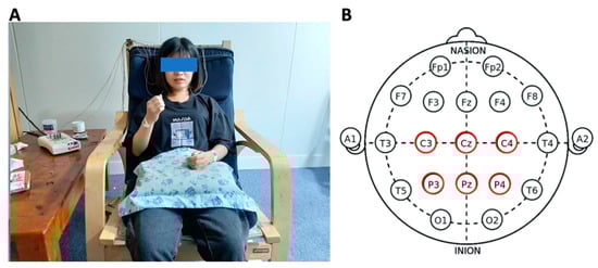 (A) Experimental setup with EEG acquired by Natus NicoletOne V32; (B) electrode placement of C3, Cz, C4, P3, Pz, and P4 according to the 10–20 International Electrode system.