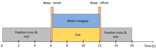 There were five measurements that occurred on five different days for each participant. There were five 8 min sessions in each measurement and a 10 min break was provided between each session. In each session, subjects were asked to pay attention to a MATLAB simulation program for 30 segments. Each segment lasted for 16 s (Figure 2): the first 6 s, the fixation cross appeared on the screen denoted relaxation state (no physical movements or mental activities); the next 6 s were for kinesthetic motor imagery tasks accompanied with cue denoted by a red arrow pointing left, right, and downward (for left hand, right hand and feet respectively); the last 4 s were for cue offset and subjects returned to relaxation. A cue onset and offset were indicated by a beep sound. In total, each subject has around 220–250 trials for each class. However, some were unable to complete the full experiment due to an inappropriate schedule. Subjects “ID03”, “ID06”, “ID10”, “ID12” have exceptionally fewer trials, approximately 180, 195, 140, and 134 trials for each class, respectively.