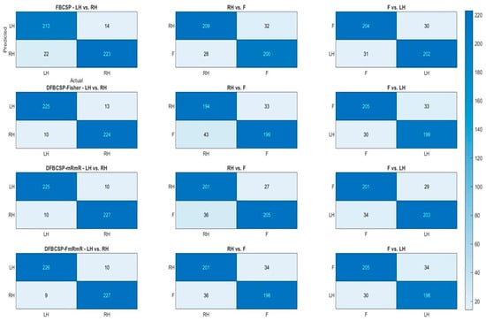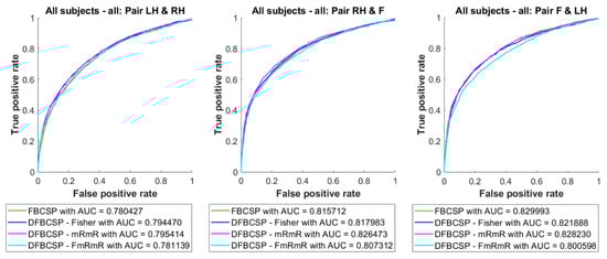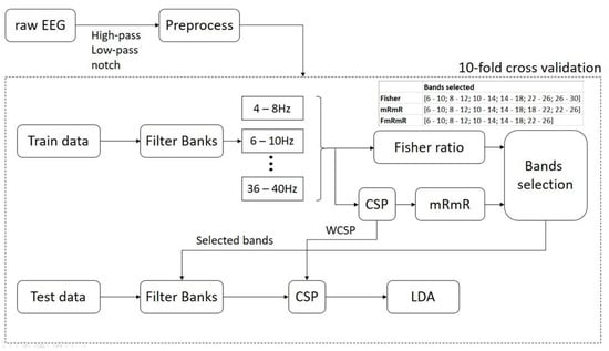 The selection criteria of this study are as follows: we take the intersection of the two cases, which means the common filter banks are selected as the final selection. If the intersection is not possible, the filter banks selected in the mRmR case will be chosen as it is claimed to be more effective than Fisher’s [,,]. In the testing phase, the test data goes through the filter bank which was previously chosen in the training phase and the features are extracted with the corresponding WCSP. In the last step, LDA is utilized to perform binary classification.
