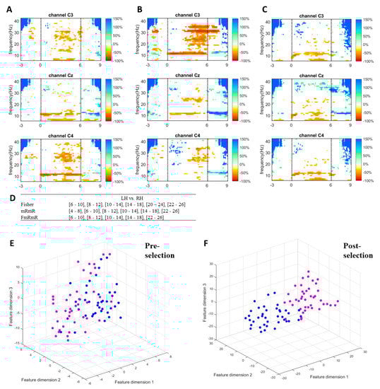 To visualize how informative features are extracted and selected by the proposed method, ERD/ERS responses, discriminative frequency bands, and features dimensions of a single measurement of a random subject of the self-acquired dataset are plotted in Figure 4. Figure 4A–C shows the responses in the time-frequency map of a random subject when performing left hand, right hand, and feet imagery respectively. Only C3, Cz, and C4 were plotted to represent the sides of the cortex. The imagination of limb movement causes ERD in mu and beta waves on the contralateral hemisphere [,,,,]. The more dominant mu (10–14 Hz) and beta (22–26 Hz) suppressions of left-hand imagery can be seen on channel C4, while those of right-hand imagery are on channel C3. As feet imagery involves imagination of moving both feet and its somatosensory area is close to the mid-central of the cortex, the feet imagery causes mu suppression in C3, Cz, and C4. These features (frequency bands and channels) are informative for discriminating the tasks from one another. The proposed method successfully selected the most informative features (Figure 4D) for left hand vs. right hand. By simultaneously performing Fisher’s ratio and mRmR algorithms, the proposed method selected features by choosing the common bands between the two algorithms. Comparison between pre-selection of features (Figure 4E) and post-selection of features (Figure 4F) is performed by mapping the feature vectors on a 3D plane using t-distributed stochastic neighbor embedding (t-SNE) []. t-SNE is a non-linear dimensionality reduction algorithm that visualizes high dimensional data in two or three dimensions but preserves relative distances between objects. The features in Figure 4F are more discriminable than those in Figure 4E after the bands were selected by the proposed method.