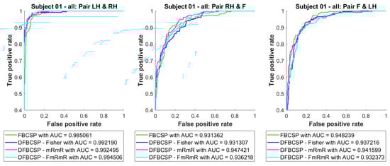 ROC curve and AUC of three binary classifiers for three pairs, “Left hand vs. Right hand”, “Right hand vs. Feet” and “Feet vs. Left hand” respectively left to right. Four feature extraction algorithms are in different colors.