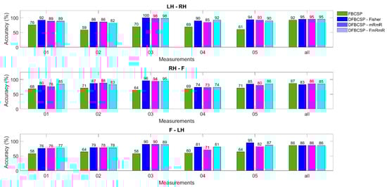 To evaluate the classification capacity of conventional and proposed frameworks on a reliable published dataset, both parameters for evaluation are composed in Table 1, for pair 1, pair 2, and pair 3, accordingly. The variation between F1-score and accuracy in Table 1 is not considerable, mostly under 4%, except for the pair 1 discrimination by DFBCSP—Fisher in subject 4, which is nearly 7%. Furthermore, the mean values of the two metrics are not different from each other, indicating the stability of the method as well as the data. A noteworthy point here is that DFBCSP frameworks achieve higher performance than the FBCSP framework in nine subjects. The mean values show that DFBCSP is 7–15% better than FBCSP in terms of accuracy and F1-score. This result is consistent with previous studies [,]. Subjects “01”, “02”, “03”, “07”, and “08” have good performance based on DFBCSP frameworks in general. Moreover, the proposed DFBCSP outweighs other methods in subjects “03” and “06 for pair 1, subjects “03”, “05”, “06”, “07”, and “08” for pair 2, and subject “04”, “07”, “08”, and “09” for pair 3 (bolded values). It can be concluded that DFBCSP—FmRmR is comparable to other methods.