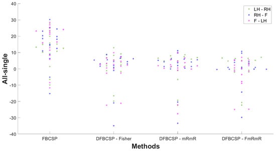 - Proposed method (DFBCSP—FmRmR): t\This method has 17 filter banks, ranging from 4–40 Hz, a 4 Hz bandwidth, 2 Hz overlapping, and the number of spatial filters m is three. Both Fisher’s ratio and mRmR are used for band selection, which can be carried out without manual screening. The selected bands are varied after each loop and can be up to six filter banks.