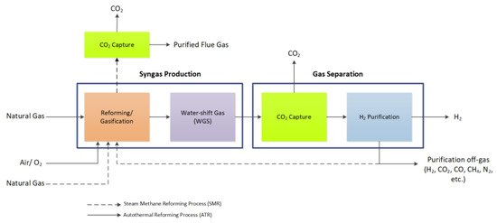 The main portion of hydrogen today is produced via methane (CH4) reforming, so-called ‘grey hydrogen’ because of its natural gas origin and the release of CO2 in the atmosphere. The cost range of this type of hydrogen is €1.5/kg which depends on the price of gas and carbon emissions [23]. According to the literature, steam conversion of one ton of CH4 releases about four tons of carbon dioxide into the atmosphere. In case the CO2 is captured and stored using CCS technology [21], the produced hydrogen is then labeled ‘blue hydrogen’. Both steam methane reforming (SMR) and auto thermal reforming (ATR) have acceptable technology readiness levels (TRL) and have considerable market share potential for the production of blue hydrogen and have almost the same route in which natural gas reacts with hot steam leading to the production of syngas. The process consists of natural gas pre-treatment, pre-reforming, reforming, water-gas-shift reaction, and hydrogen separation [24,25]. The sizes of SMR and ATR plants vary in a range of 15,000–300,000 nm3/h [14]. The process flow of blue hydrogen at the system level is briefly shown in Figure 1 [21]. Syngas production, separation technologies, advanced hydrogen production with CO2 capture, and outlook on production and use of hydrogen in a CCS context have been particularly discussed by Voldsund et al. [21].