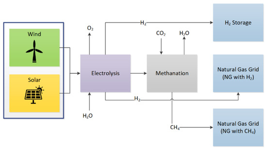 ‘Green hydrogen’, however, is produced via an electrolysis process by converting electricity generated from renewable energy (e.g., wind and solar) into hydrogen, which can be stored in large tanks and released when/if needed. The cost range of this type of hydrogen is €2.5–5.5/kg. No GHG is emitted during the process of green hydrogen [23]. As a matter of fact, it will contribute to coping with intermittent electrical power from wind, solar, and other renewable sources. The green hydrogen concept (i.e., Power to Gas, P2G) is shown in Figure 2 [26].