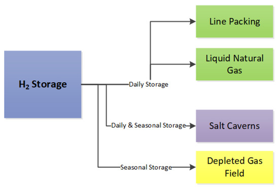 At the same time, one major key to wholly developing a hydrogen economy is safe, compact, light and cost-efficient hydrogen storage [32]. Storage of hydrogen is needed to compensate for a mismatch between supply and demand on timescales from minutes to seasons in a way that flexibility and security in delivery and purchase can be ensured [14]. Various hydrogen storage methods and their challenges are presented and briefly discussed by several researchers, for example in [33,34]. For the blue hydrogen case, it will be vital to determine the cumulative demand flexibility and the related storage volume/pattern, which will determine the selection of the storage method [14]. The most important identified methods for blue hydrogen storage are [35]: (a) Line packing (daily storage in the gas network), (b) tanks for compressed gas (daily small-scale storage in cylinders), (c) liquid hydrogen (daily small- and large-scale storage in tanks of LNG), (d) salt caverns (daily and seasonal large-scale storage), and (e) depleted gas fields (seasonal very large-scale storage). According to the literature, hydrogen storage will only be limited on a system level and would be feasible in cryogenic tanks or salt caverns [14]. A summary of H2 storage options is illustrated in Figure 4. For more details, readers are referred to [14,35,36].