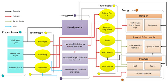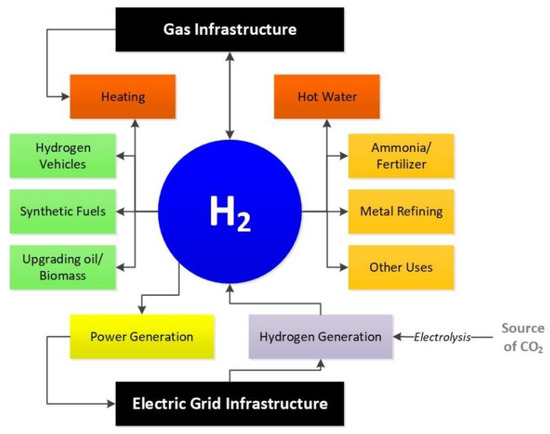 Society today is struggling to find ‘fit for purpose’ solutions while facing a number of critical interrelated problems which should be addressed within a hydrogen economy [4]: (a) global climate change goals, (b) depletion of fossil fuel resources, (c) energy poverty in many fossil resource-rich countries, and (d) job and economic growth in the face of rising global population. Hydrogen society is expected to deliver great benefits for the environment, energy security, the economy, jobs, and end-users [13,32]. The value of the hydrogen-driven energy system lies in its flexibility because hydrogen can connect different energy domains, from electricity generation to heat production to transport in future smart cities with multi-energy carriers [37]. Utilization of hydrogen as an energy carrier includes use as fuel in the transport sector, especially in shipping, as fuel for heating buildings or in heat-intensive industries, and as a medium for energy storage from renewable power generation. An assessment by Marchenko and Solomin [38] demonstrates that the electricity economy proves more desirable in the case of short-term energy storage, while the use of hydrogen is more advantageous in the case of long-term storage.