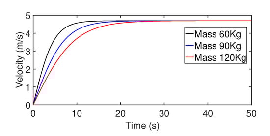 where the K constant accounts for the initial conditions. This is a known result, for example, in ballistic problems applied to sport [20]. Figure 1 represents the above function starting from the rest; the horizontal asymptote of this solution represents the limiting velocity approached by the solution, with value , also known as terminal velocity [20], where the constant force and drag coefficient appear but not the mass. The mass appears in the denominator of the coefficient that accompanies the time variable in the hyperbolic tangent function; the higher the mass, the equally limiting the velocity, but the longer the transient to it and vice versa. Figure 2 represents this situation and uses three representative masses of the problem and realistic coefficients.