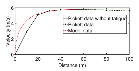 It is also possible to adjust speed–distance curves published by other authors. For example, Pickett et al. [25] present speed–distance curves over 200 m with elite paddlers. These curves show the acceleration interval, the passage through a speed maximum and a third phase of slight deceleration associated with fatigue. The data are obtained with an interval of 10 m and are not precise enough to observe the dynamics of each stroke, but they allow estimations of the asymptotic term. As our model does not consider fatigue, we assume that the maximum velocity corresponds to 99% of the asymptotic velocity and that, thereafter, no fatigue appears, i.e., the velocity is maintained or increases very slightly toward its asymptotic velocity. As the data were measured with elite paddlers, we also assume that their average force is of the order of those already published by Gomes et al. [9] or Treus et al. [15], and therefore are of the order of N. From the expression obtained in Equation (6), and with the assumptions made, we can clear the resistance coefficient.