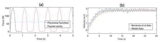 The average force is about N, and the equilibrium velocity can be extracted from the paper graph. We take m/s; from both drag coefficients, we can estimate kg/m. The estimated mass is about 80 kg (the paddler mass is 68 kg). Finally, the stroke frequency is over 65 strokes/minute and can be easily estimated from the paper figure; we fine tune its exact value to better reproduce the oscillatory part of the solution to conclude with a value of 64.95 strokes/minute. These are the set of parameters needed to feed the model. By using it and the stroke model described, the differential equation can be solved following the procedure of Section 3.4 and compared with the published graph. Figure 11 shows this comparison.