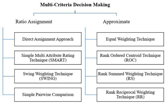 Within each branch of the taxonomy, we have selected the techniques which are most usable in practice. Note that some techniques may be better but are unwieldy. Within each category, the techniques are ordered first by direct and then indirect methods, and then notionally from easiest for the decision maker to implement and use to the more difficult weighting methods, requiring more time and resources to set up the weights for the attributes. Borcherding, Eppel [60] suggest that the ratio, swing, tradeoff, and pricing out methods are most commonly used in practice for MCDA. However, more recently, researchers have focused on direct methods for determining weights, including equal and rank-order weighting methods. Weights are often obtained judgmentally with indirect methods [61]; therefore, direct methods that remove some of the subjectivity while determining appropriate weights have become increasingly popular.