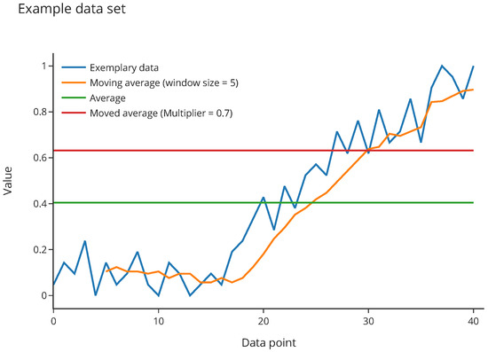 In the context of this publication a trend is defined as the gradual change in future events from past data in a time series [30]. Trend detection can be differentiated from remaining useful life (RUL) estimation by several aspects. In contrast to RUL estimation, trend detection methods do not extrapolate existing time series into the future. Furthermore, no thresholds for the extrapolated time series are defined which describe the end of lifetime of an asset. Trend detection methods have different purposes. It is possible to differentiate between models for change point detection, trend description and identification of trend presence in a time series. For the considered application, a model is required that answers the question of whether a trend is present. This is why the remainder of this subsection focuses on the field of trend presence identification. Here, various statistical tests exist. The Mann-Kendall test (MK) is a sign test based on pairs of all samples of a time series and their predecessors [31] to detect trends. The Cox-Stuart (CS) test uses a reduced amount of data pairs for a sign test [32] to achieve the same objective. The Wilcoxon-Mann-Whitney trend test builds a test statistic based on the signs of the slopes between samples and the rank sums of the samples with an increasing and decreasing slope [33] for this purpose. The Durbin-Watson test checks for auto-correlation in the residuals of a regression fit. If the residuals do not show autocorrelation, a trend can be assumed [34]. Furthermore, slope based approaches in combination with thresholds exist. The most simple approach from this field is to fit a linear or quadratic function to the time series data, calculate the slope of this function and compare it with a threshold. This model will be named linear regression model, short LR, for the rest of the publication. If the slope exceeds the threshold value, a trend can be assumed. A more complex approach for trend detection is based on the clustering of a time series. In a first step, a clustering algorithm (e.g., Fuzzy-K-Means) is used to detect clusters within the time series. Then, the slope between the cluster centres is determined. Finally, the slope values of the cluster centres are compared with a threshold to decide, whether a trend exists [35]. The last approach for trend detection presented in this section is based on the comparison of the time series’ moving average with its overall mean (moving average model, short MA). In a first step, these two quantities are calculated. Afterwards, the time series’ standard deviation multiplied by a factor is added to the overall mean to determine a threshold. Then, it is determined, whether the moving average of the signal rises above this threshold for a defined time window. If this is the case, it can be assumed that a trend is present in the signal. The principle behind this method is also illustrated in Figure 1.